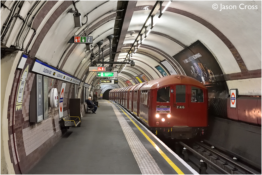 The 1938 Tube Stock heritage train passes through Caledonian Road with a Northfields to Oakwood tour. Date: 19 May 2019 Manipulation Notes: None