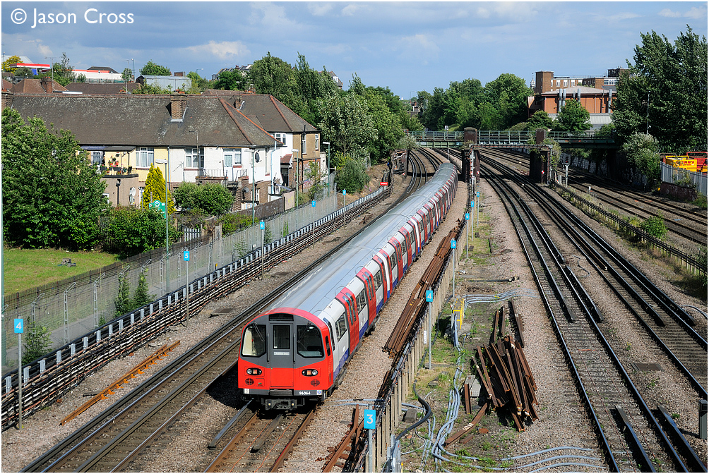 96064 brings up the rear of a southbound train of Jubilee Line 1996 Stock as it departs from Neasden. Date: 19 June 2011 Manipulation Notes: None