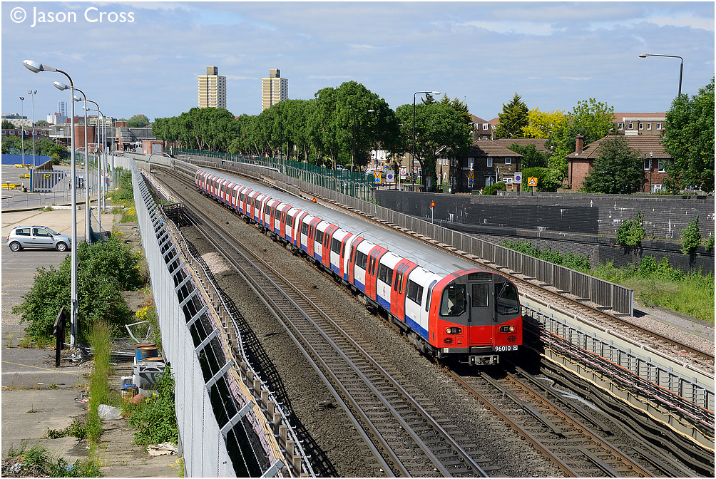 96010 leads a train of Jubilee Line 1996 Stock away from West Ham. Date: 8 June 2013 Manipulation Notes: None