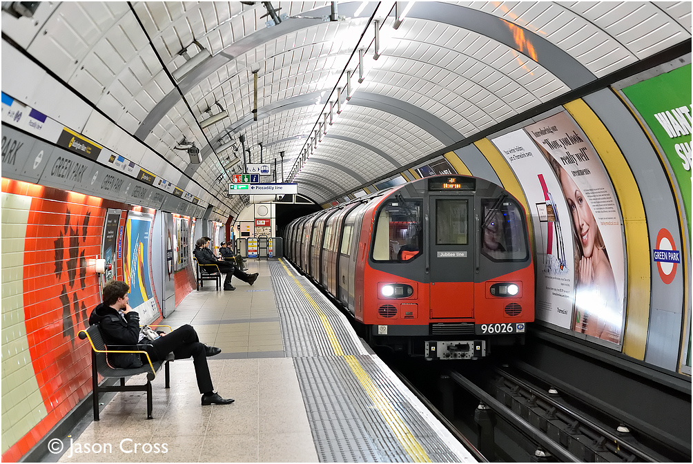 96026 leads a Stratford to Stanmore Jubilee Line Night Tube service into Green Park. Date: 4 March 2017 Manipulation Notes: None