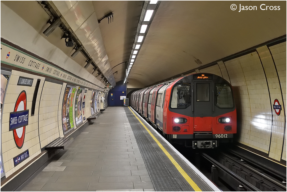 96012 leads a Stratford to Wembley Park Jubilee Line service into Swiss Cottage. Date: 27 April 2019 Manipulation Notes: None