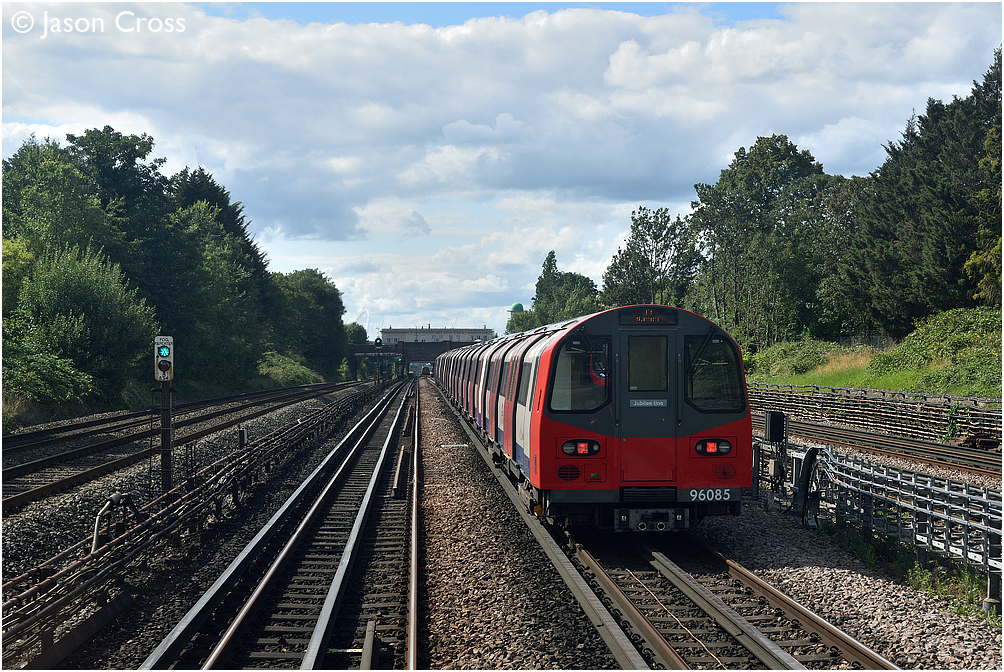 96085 on the rear of a Stanmore bound Jubilee Line service on the approach to Willesden Green. Taken from the cab of a Metropolitan Line train during an authorised cab ride. Date: 18 August 2019 Manipulation Notes: None