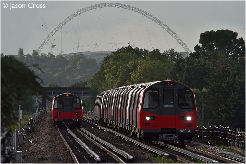 Two trains of Jubilee Line 1996 Tube Stock pass near Canons Park. Date: 6 October 2019 Manipulation Notes: None