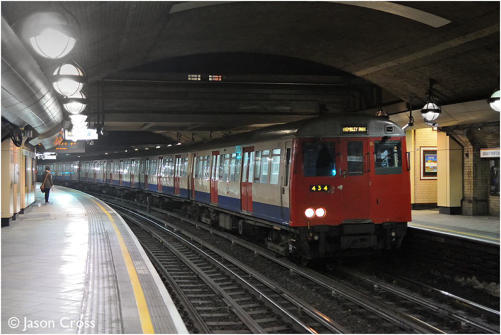 Line service arrives at Great Portland Street formed of A Stock with driving