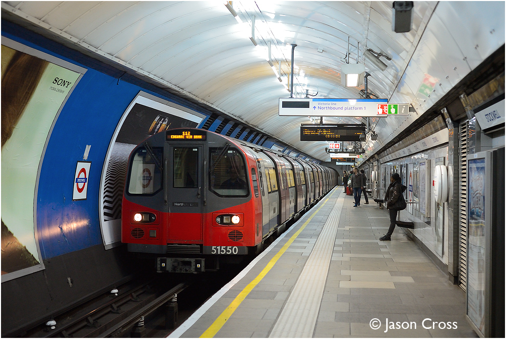An Edgware bound Northern Line train of 1995 Stock at Stockwell. Date: 23 December 2012 Manipulation Notes: None