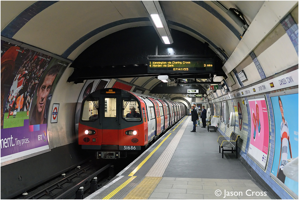 51686 leads a train of 1995 Stock into Camden Town while working an Edgware to Kennington Northern Line service. Date: 25 May 2015 Manipulation Notes: None