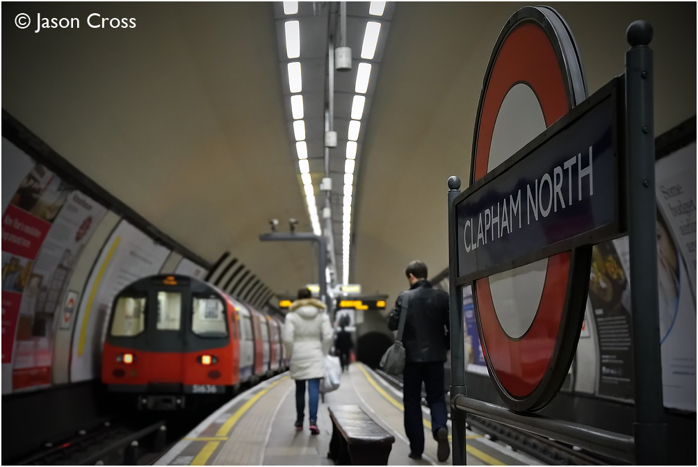 An arty picture of a Northern Line train of 1995 Stock departing from Clapham North. Date: 2 January 2016 Manipulation Notes: None