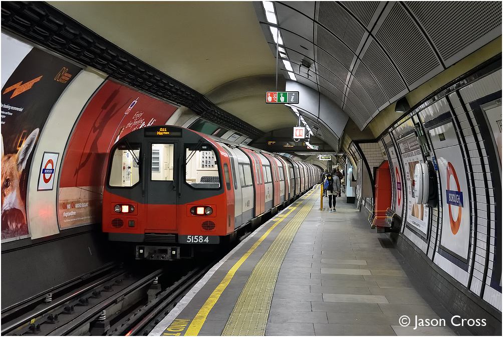 An Edgware to Morden Northern Line train of 1995 Stock departs from Borough with 51584 on the rear. Date: 14 January 2017 Manipulation Notes: None