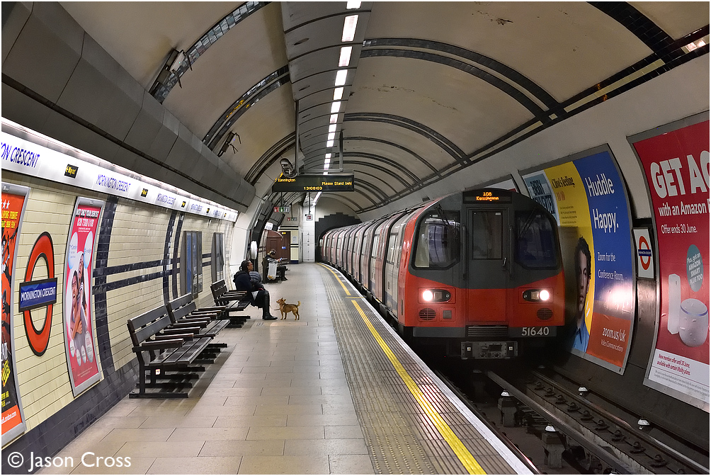 On the Northern Line, a High Barnet to Kennington service arrives at Mornington Crescent. Date: 19 May 2019 Manipulation Notes: None