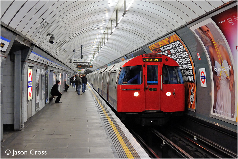 A train of 1967 Tube Stock arrives at Vauxhall with a Victoria Line service for Brixton. Date: 19 February 2011 Manipulation Notes: None