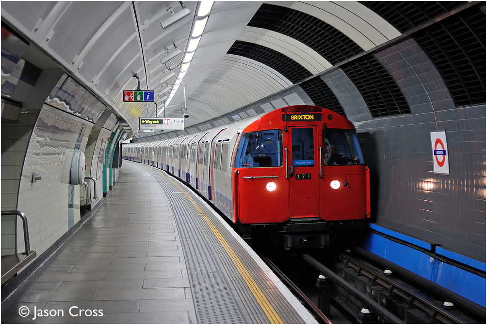 A train of 1967 Tube Stock arrives at the Victoria Line's southern terminus at Brixton.