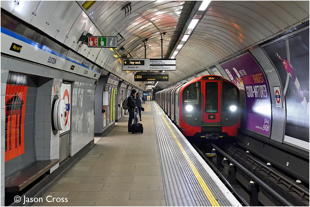 11055 draws to a halt at Euston with a Brixton bound Victoria Line service. Date: 27 December 2015 Manipulation Notes: None