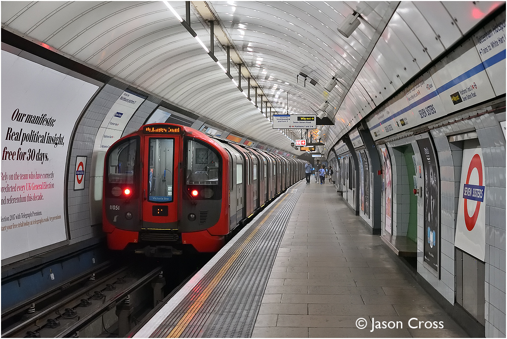 Rear view of 11051 leaving Seven Sisters with a Brixton to Walthamstow Central Victoria Line service. Date: 25 June 2017 Manipulation Notes: None