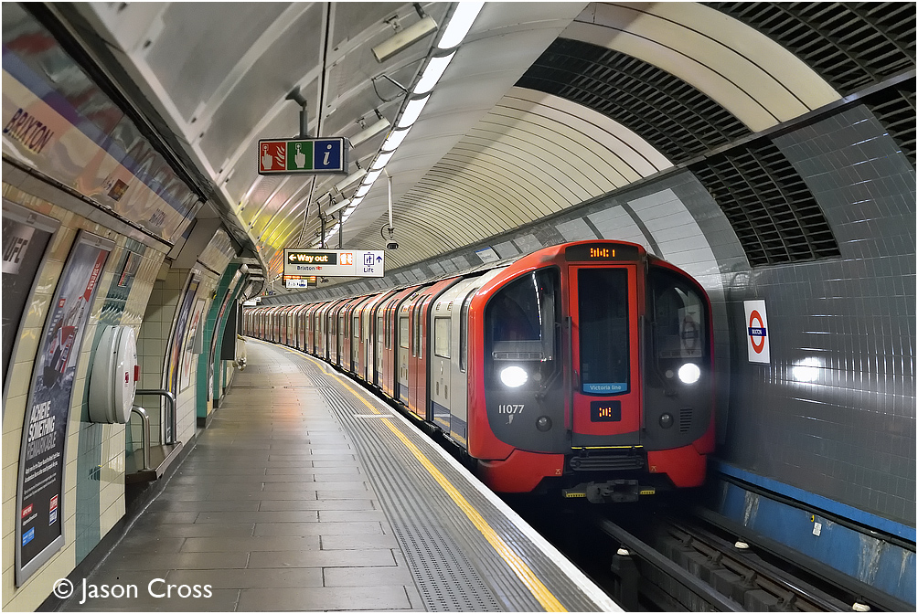 11077 arrives at Brixton with a Victoria Line service from Walthamstow Central. Date: 14 January 2018 Manipulation Notes: None