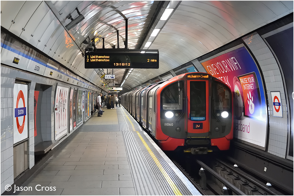 A Brixton to Walthamstow Central Victoria Line service arrives at Euston. Date: 19 May 2019 Manipulation Notes: None