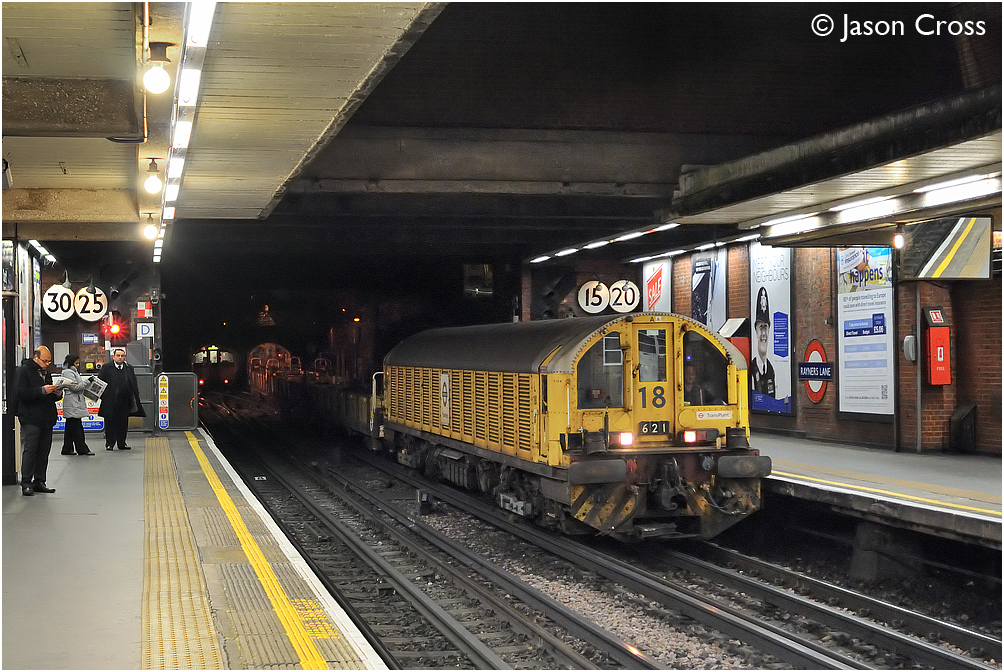 L18 leads an engineering train through Rayners Lane. It was en route to Ruislip Depot from an overnight possession on the Northern Line. Date: 11 January 2012 Manipulation Notes: None