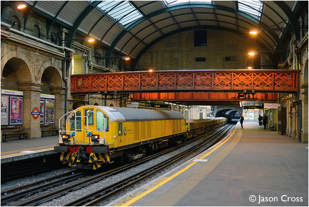 L25 at Paddington (Praed Street) station on the rear of a Ruislip Depot to Aldgate engineer's train. Date: 24 February 2013 Manipulation Notes: None