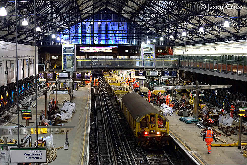Battery loco L19 draws forward through Earl's Court station during an engineering possession. Date: 28 December 2013 Manipulation Notes: None