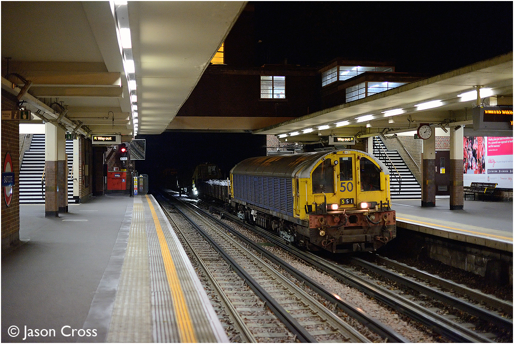 L50 enters Eastcote station while working a Ruislip Depot to Monument engineer's train. Date: 1 November 2014 Manipulation Notes: None
