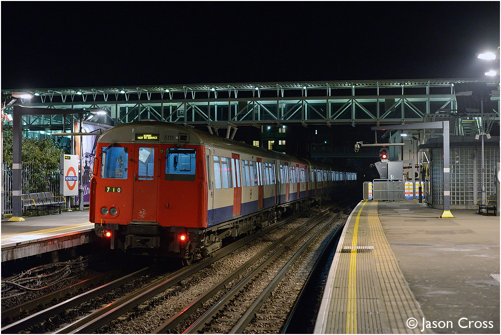 With 5111 on the rear, the A Stock Rail Adhesion Train passes through Wembley Park. Date: 29 November 2014 Manipulation Notes: None