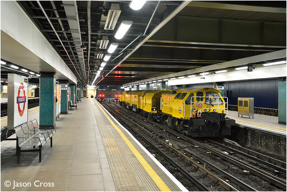Schweerbau RGS rail grinder stabled in Moorgate station prior to working overnight at King's Cross. Date: 10 January 2017 Manipulation Notes: None