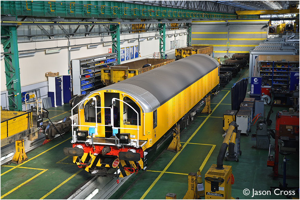 Battery loco L19 on stands in the workshops at Ruislip Depot. Photo taken with permission during an officially authorised visit. Date: 8 April 2017 Manipulation Notes: None Camera mounted on a tall pole and remotely fired