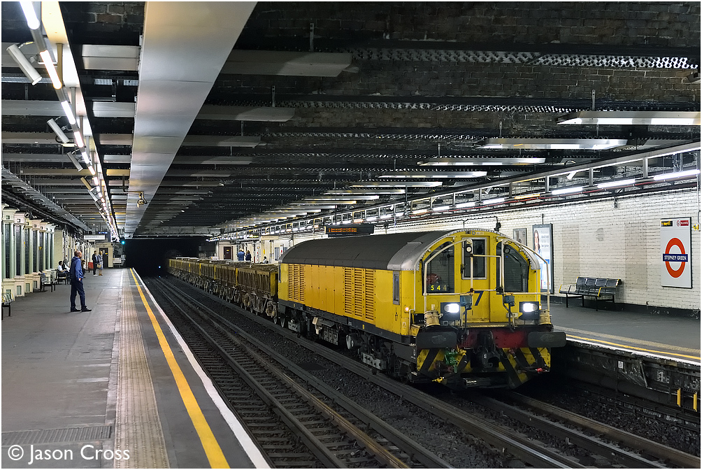 L17 rolls into Stepney Green with train 544, an East Ham to Ruislip Depot engineer's train loaded with spoil. Date: 19 August 2017 Manipulation Notes: None