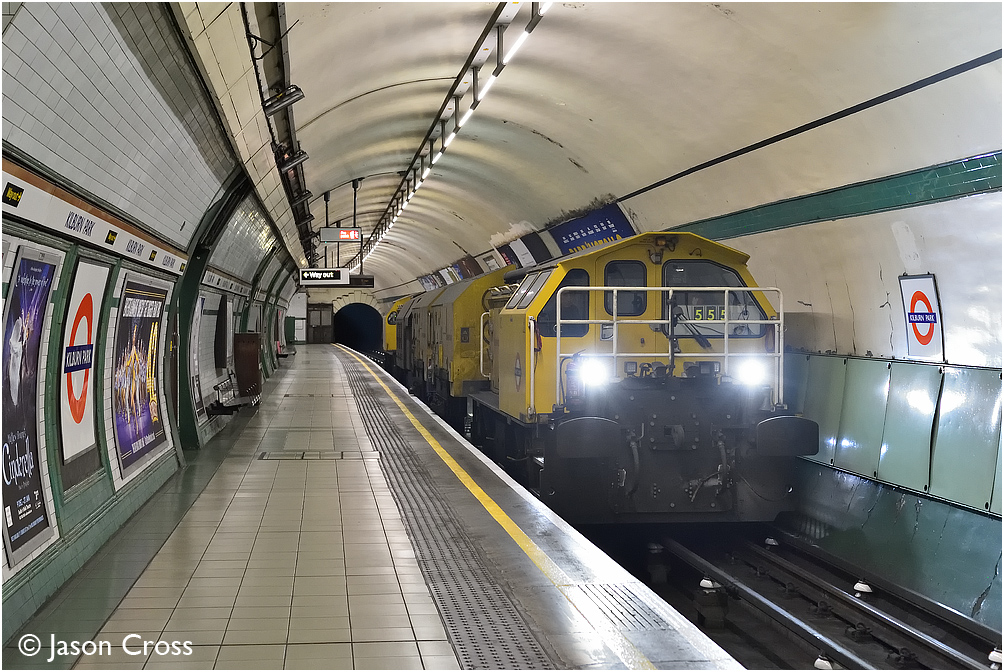 The Schweerbau RGS rail-grinder arrives at Kilburn Park while heading back to Queen's Park for stabling after working overnight at Lambeth North. Date: 4 November 2017 Manipulation Notes: None