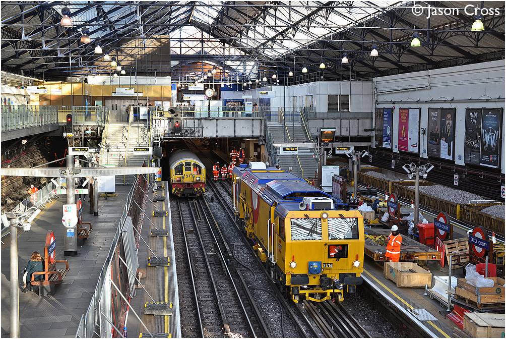 Matisa Tamping machine TMM776 and battery loco L51 at work in an engineering possession at Earl's Court (District Line). Date: 28 December 2017 Manipulation Notes: None