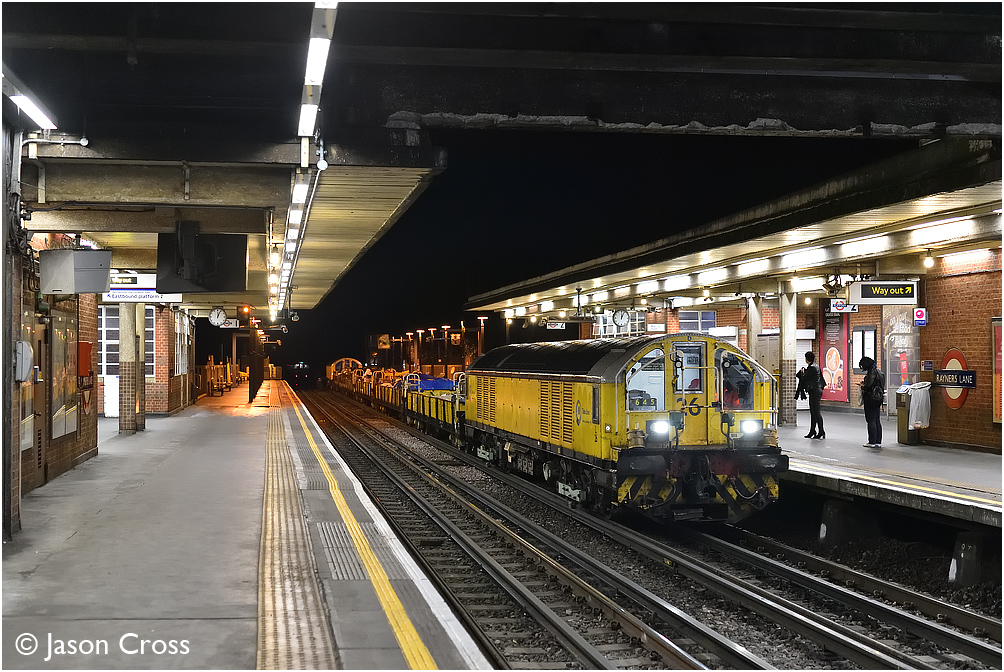 L26 passes through Rayners Lane with train 645, which was heading for a possession on the Northern Line at Camden Town. Date: 30 March 2018 Manipulation Notes: None