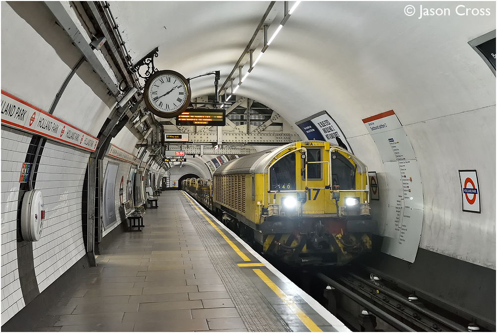 L17 passes through Holland Park with a Ruislip Depot to South Woodford engineer's train. Date: 8 September 2018 Manipulation Notes: None