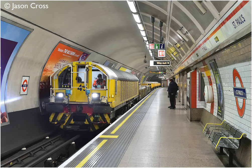 With a copy of my book 'London Underground Guide 2019' on display in the cab window, L45 passes through St. Paul's with train 546, an 0055 Ruislip Depot to South Woodford engineering train. Date: 6 April 2019 Manipulation Notes: None