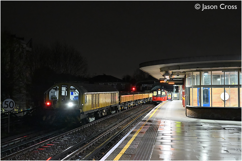 L26 passes Kilburn on the rear of a Ruislip Depot to Finchley Road engineer's train. Date: 23 November 2019 Manipulation Notes: None