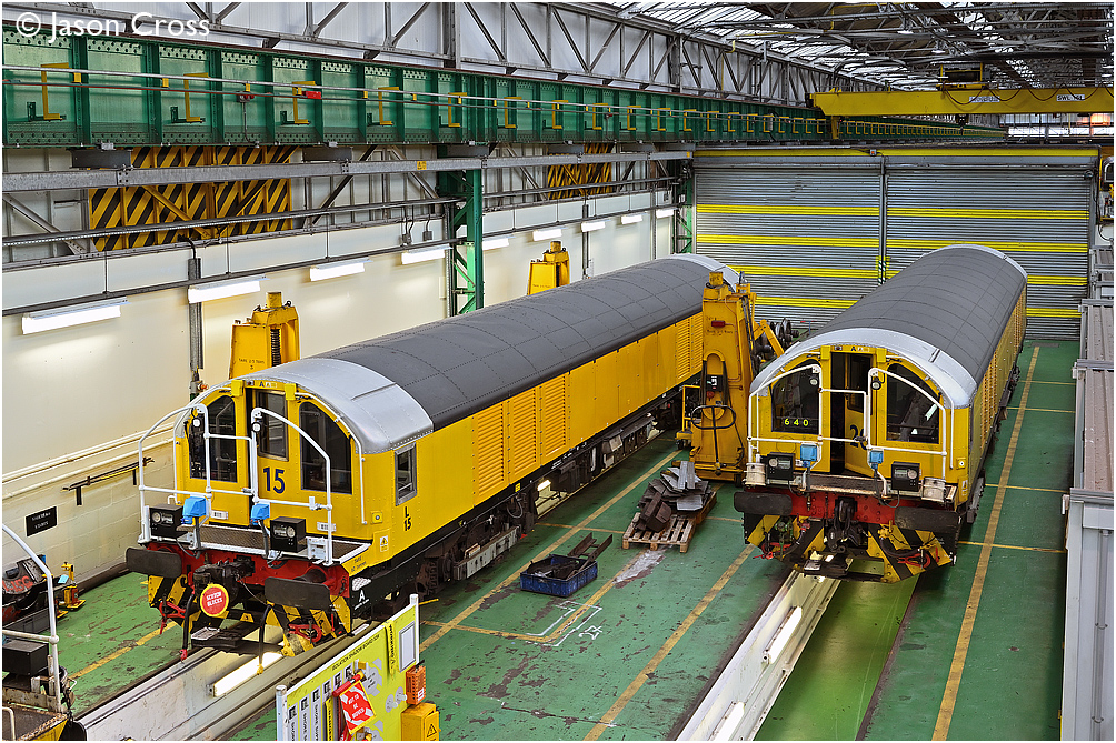 L15 and L20 in the Transplant workshops in Ruislip Depot. Photo taken during an authorised visit. Date: 14 December 2019 Manipulation Notes: None Camera mounted on a tall pole and remotely fired