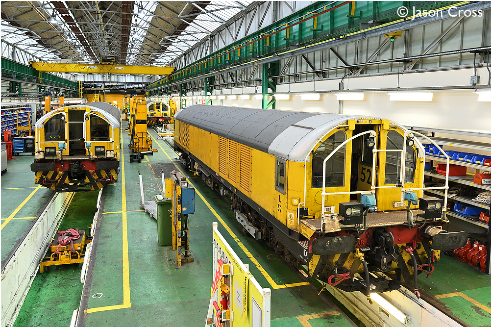 L52, L19 and L16 in the Transplant workshops in Ruislip Depot. Photo taken during an authorised visit. Date: 14 December 2019 Manipulation Notes: None Camera mounted on a tall pole and remotely fired