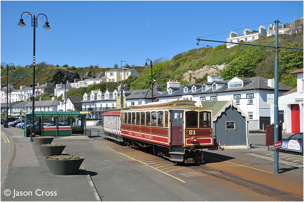 Car 21 and trailer 43 wait to depart from Derby Castle with the 1140 to Ramsey. Date: 1 May 2011 Manipulation Notes: None