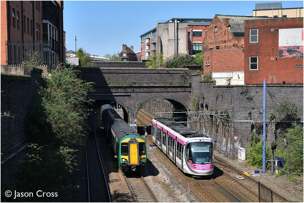 28 heads north at Kenyon Street with a Grand Central to Wolverhampton St George's service as 172338 passes by with the 2S34 1125 Kidderminster to Whitlocks End. Date: 5 May 2018 Manipulation Notes: None