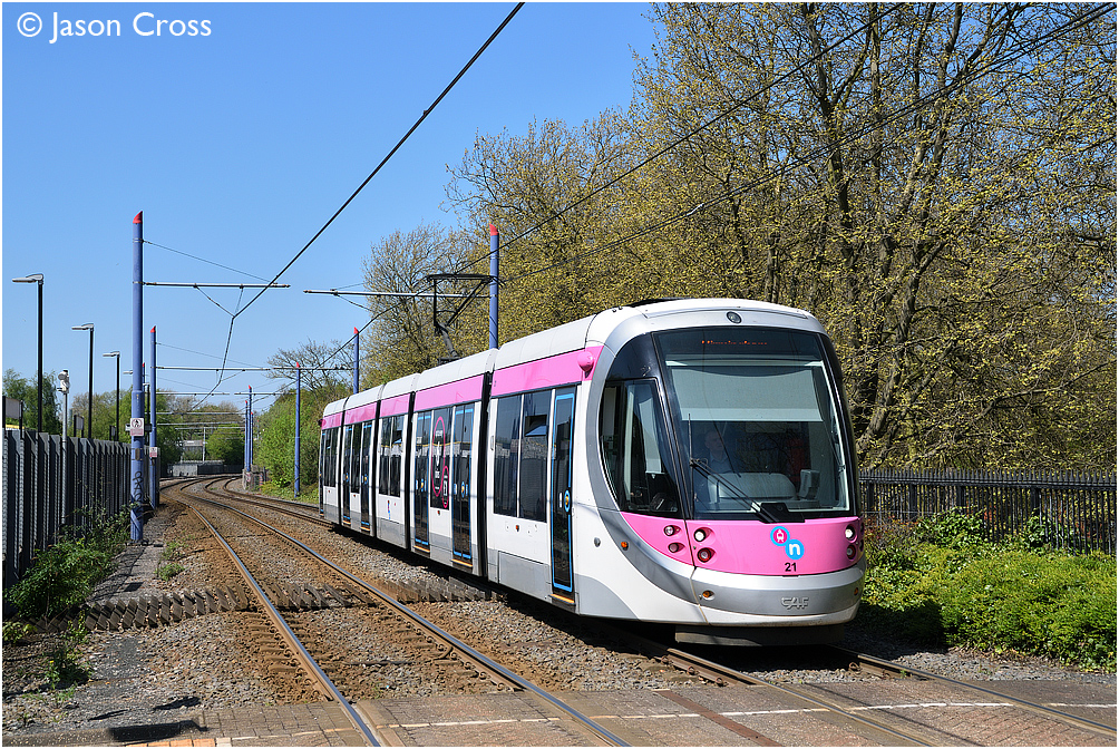 21 arrives at the Jewellery Quarter tram stop with a Wolverhampton St George's to Grand Central service. Date: 5 May 2018 Manipulation Notes: None