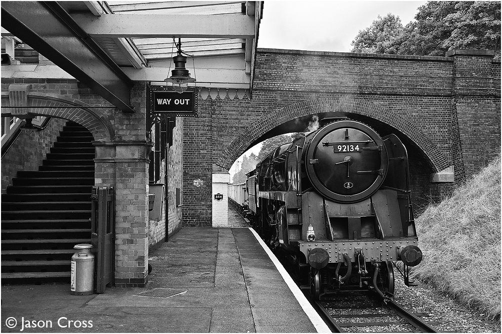 Visiting 9F 92134 passes through Rothley with the 0815 Loughborough Central to Leicester North minerals. GCR Autumn Steam Gala. Date: 2 October 2021 Manipulation Notes: None