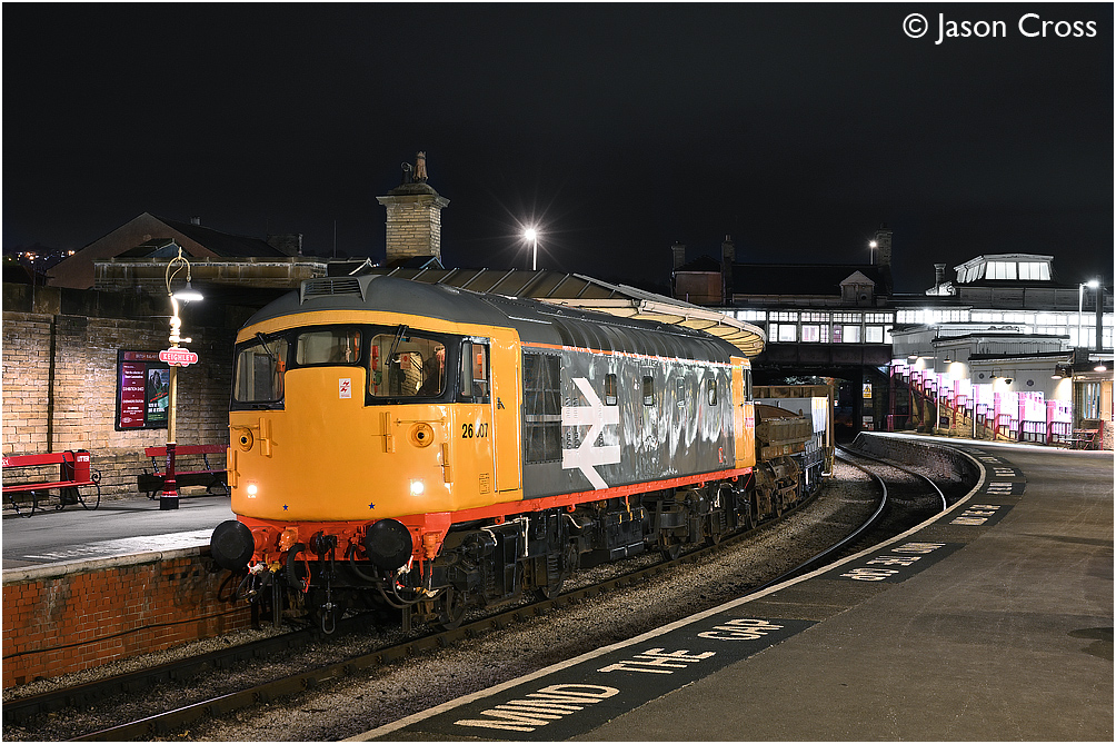 26007 stands in Keighley station with a short ballast train. EMRPS photo charter. Date: 23 October 2021 Manipulation Notes: None