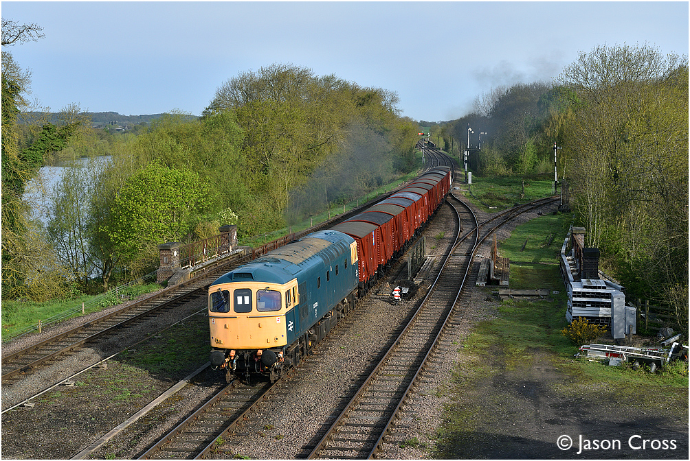 33035 powers through Swithland Yard with a rake of box vans in tow. EMRPS photo charter. Date: 3 May 2018 Manipulation Notes: None Camera mounted on a tall pole and remotely fired