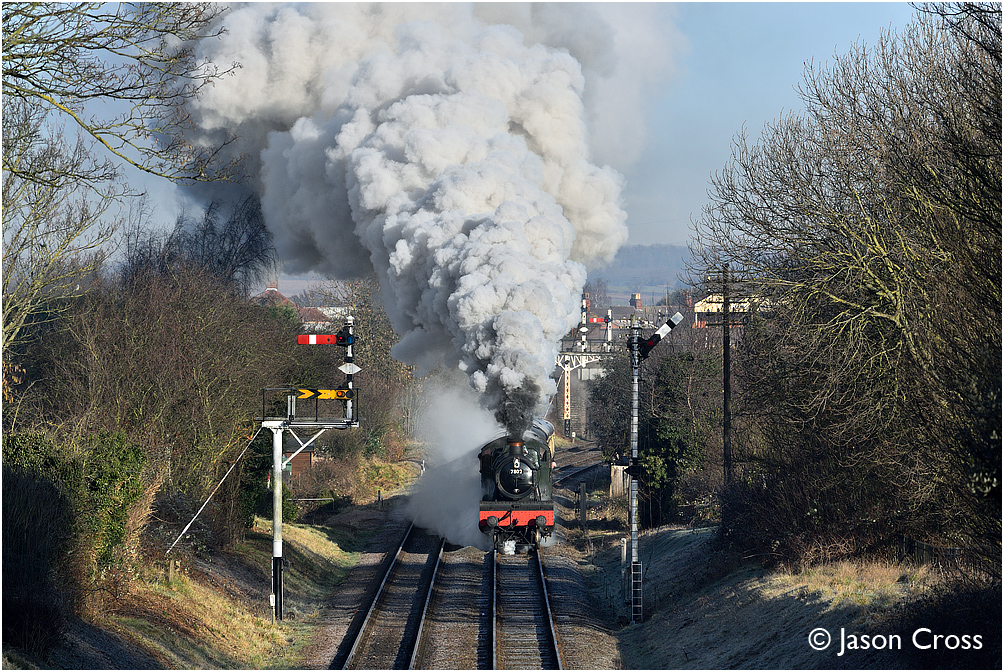 7802 'Bradley Manor' makes a volcanic departure from Loughborough Central with the 0930 to Leicester North. Date: 3 February 2019 Manipulation Notes: None
