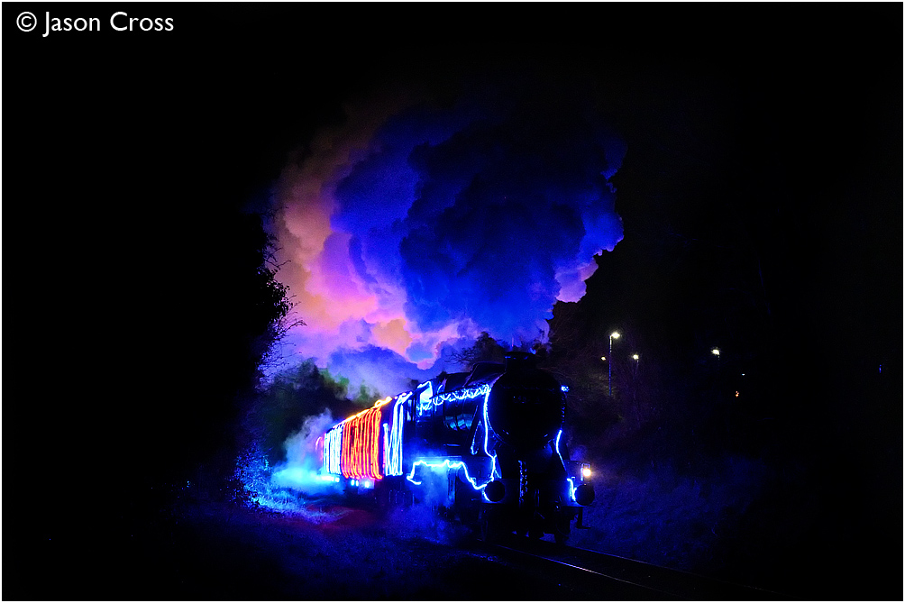 8F 48305 passes through Birstall on the Great Central Railway with a Winter Wonderlights Express. Date: 1 December 2019 Manipulation Notes: None