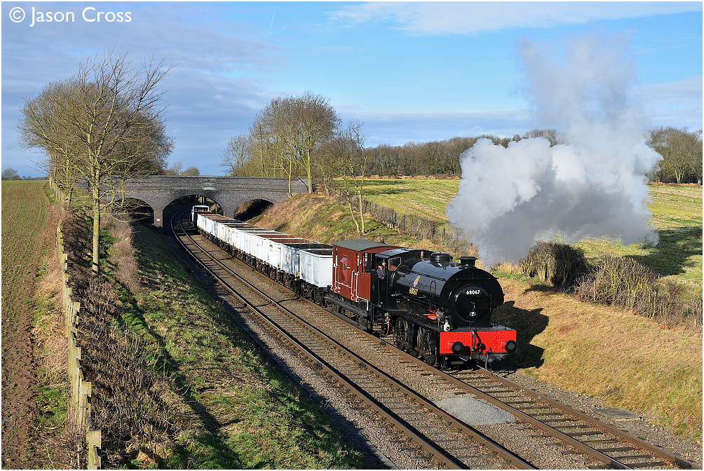 J94 68067 clanks through the cutting near Rabbit Bridge with a Loughborough to Swithland Yard goods. GCR Winter Steam Gala. Date: 28 January 2018 Manipulation Notes: None Camera mounted on a tall pole and remotely fired