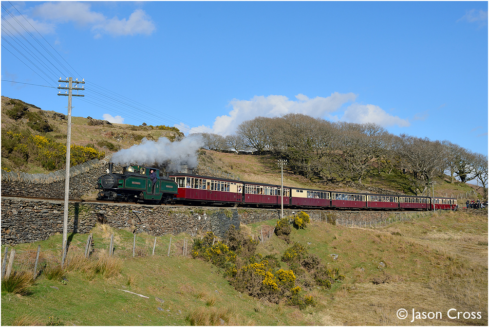 'Earl of Merioneth' passes Campbells Platform with the 1740 Blaenau Ffestiniog to Porthmadog. Date: 1 May 2013 Manipulation Notes: None