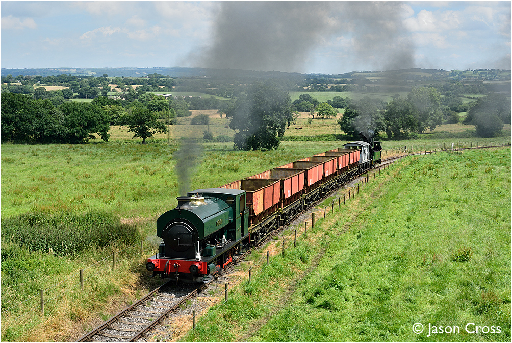 Avonside 0-6-0ST 'Cranford' attacks Foxfield Bank with Dübs Crane tank 4101 banking. Foxfield Railway Summer Steam Gala. Date: 17 July 2016 Manipulation Notes: None Camera mounted on a tall pole and remotely fired
