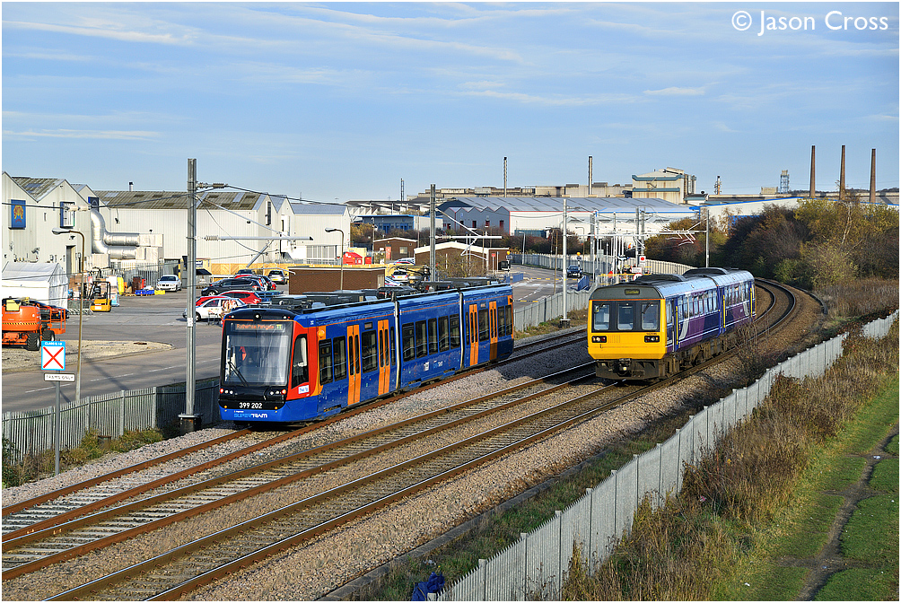 399202 arrives at Rotherham Parkgate with a service from Cathedral while 142096 passes with a Hull to Sheffield service. Date: 14 November 2018 Manipulation Notes: None