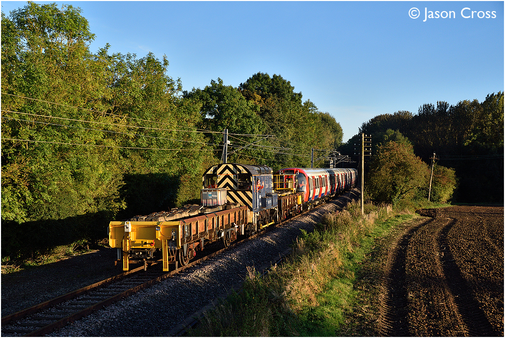 08892 drags S Stock unit 21468-21467 from Asfordby Test Centre to Old Dalby and is seen passing Saxelbye. Date: 3 October 2016 Manipulation Notes: None Camera mounted on a tall pole and remotely fired