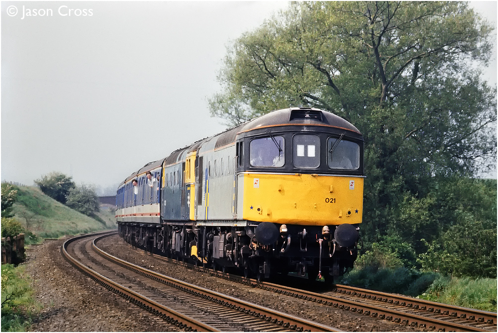33021 and 33022 head the 1110 Leicester to London St Pancras via Corby working during the Inter City Diesel Day. Date: 21 May 1989