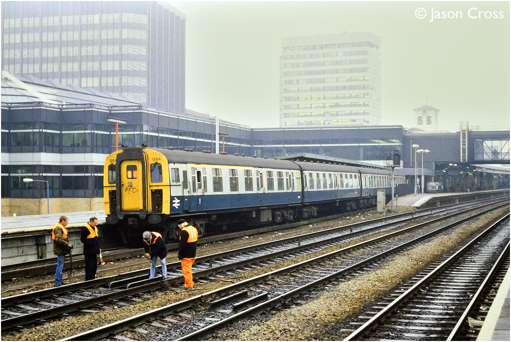 A track gang gets to work while 4-CIG 1254 waits to depart from Reading with the 1124 to London Waterloo. Date: 4 December 1989